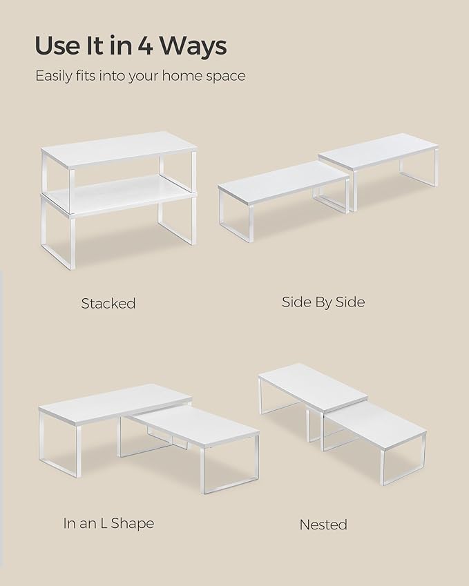 - [Adjustable] With their unique design, with one slightly smaller than the other, these shelf organizers can be stacked on top of one another, nested, used separately, or even in an L-shape. Adjust them how you want to perfectly fit your kitchen space
