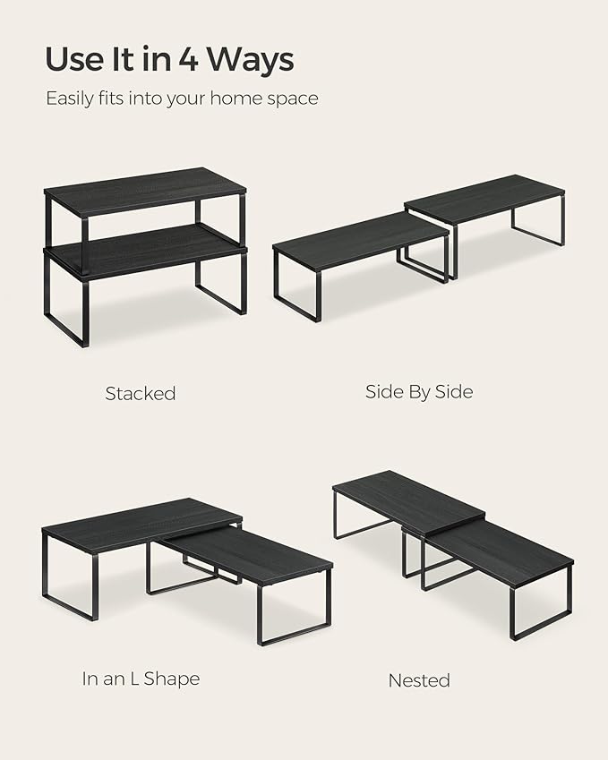 SONGMICS Cabinet Organizer Shelf, Set of 2 Kitchen Counter Shelves, Kitchen Storage, Spice Rack, Stackable, Expandable, Metal and Engineered Wood, Ink Black and Charcoal Black UKCS025B01
