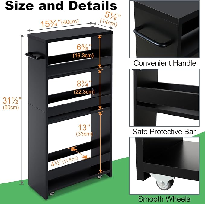 - 【Slim Design for Small Spaces】The slim storage cart is made of high quality MDF board and the size is 5.51"D x 15.75"W x 31.5"H. It can provide versatile storage in compact space.