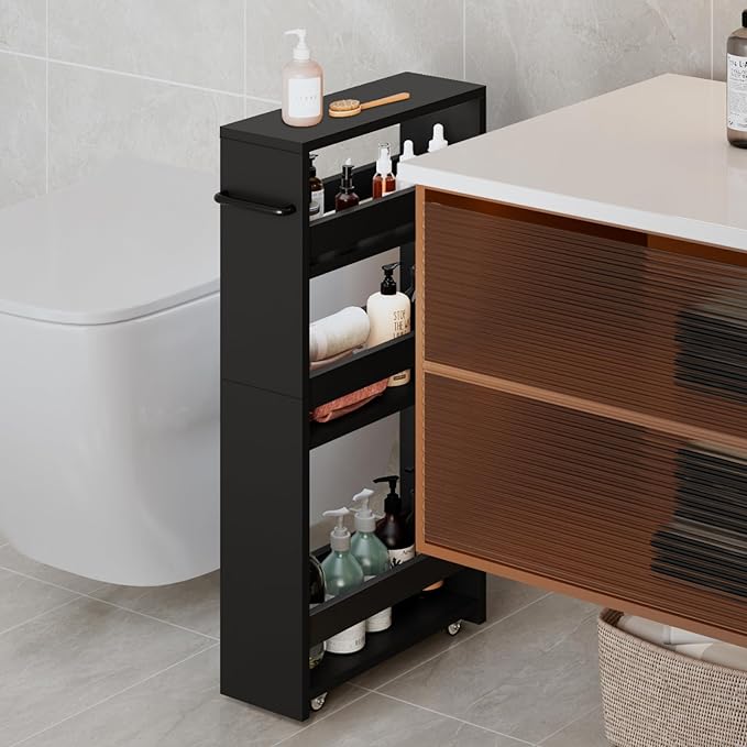 - 【Multifunctional Slim Storage Rack】Space saving organizer is very suitable for tight spaces, such as kitchen next to fridge or closets, laundry rooms between washer and dryer, offices, living room, bathrooms, garages and dorm.