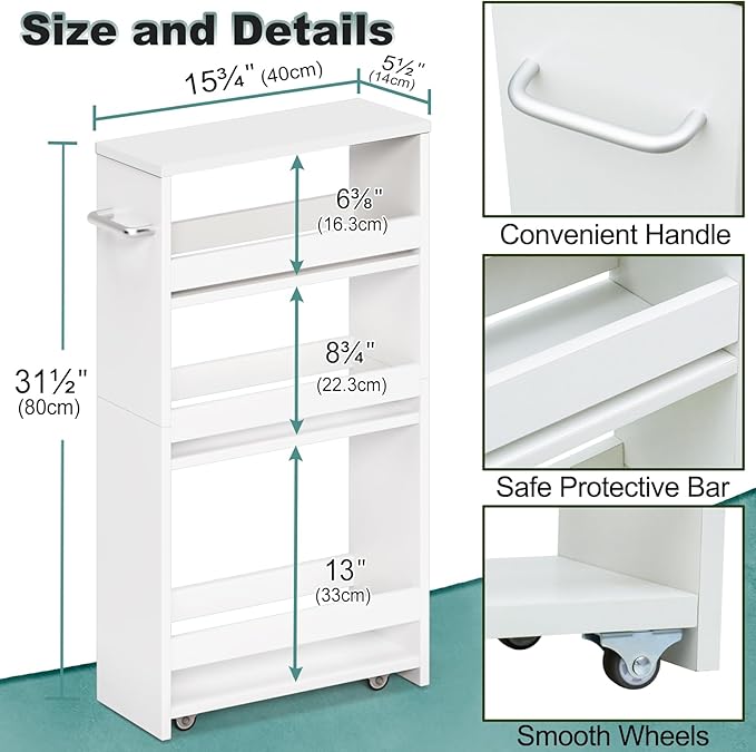 - 【Slim Design for Small Spaces】The slim storage cart is made of high quality MDF board and the size is 5.51"D x 15.75"W x 31.5"H. It can provide versatile storage in compact space.