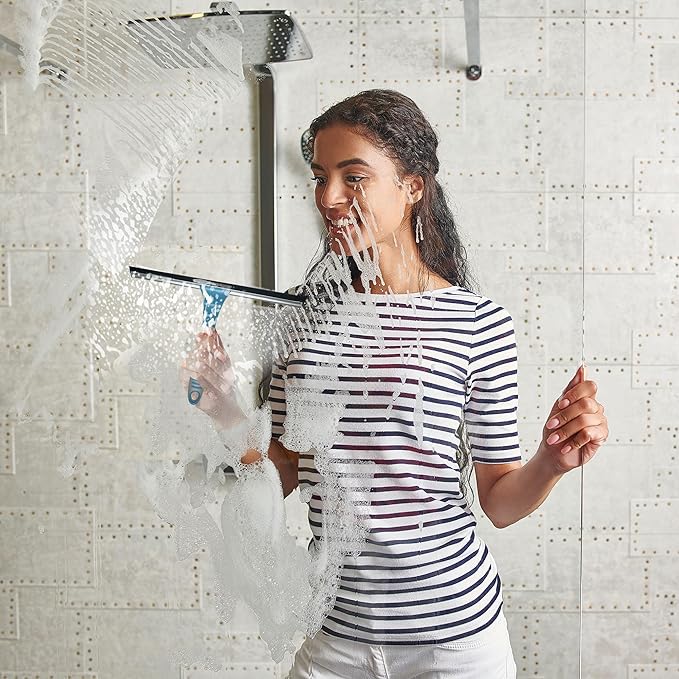 - Durable Bristless - The bathroom brush has a stiff durable bristle for long and useful life. The shower cleaning brush is strong enough to use with harsh chemicals. The bristles scrub away grime, scum, soap, dirt, and other contamination of any intensity without damaging the surfaces. The bristles do not wear out or deform even with intensive daily cleaning. Thanks to the moderately stiff bristles, you can use our shower scrubber for cleaning shower without scratching its delicate surface.