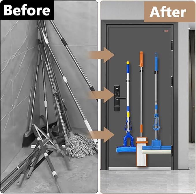 - [INDOORS OR OUTDOORS ] Using mop and broom holder wall mount tidy up your broom, mop, rakes, tools and more! Perfect for the kitchen, closet, garage, office, great for commercial use, and thanks to the waterproof design, this magnet broom even works outdoors or on the shed for your garden tools when you are using the screws