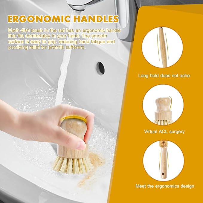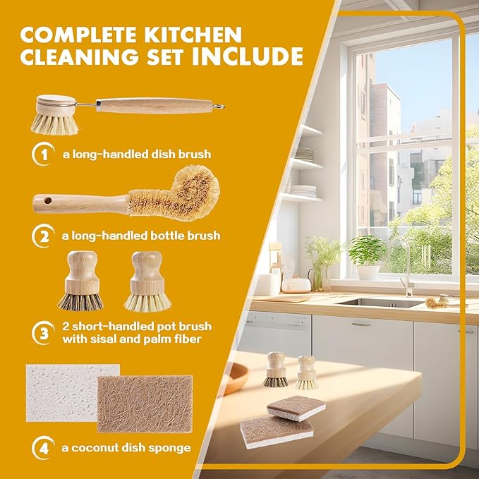 - COMPLETE KITCHEN CLEANING SET: This bamboo wooden dish brush set includes a long-handled dish brush, 2 short-handled pot brush with sisal and palm fiber, a long-handled bottle brush, and a coconut dish sponge.