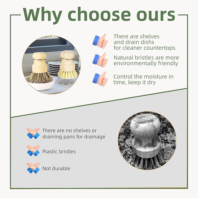 - 【High-Density Bristles & Easy Maintenance】Ultra-dense natural fibers provide superior scrubbing power . Simply rinse under water after use and let the drain rack do the drying work – no lingering odors!