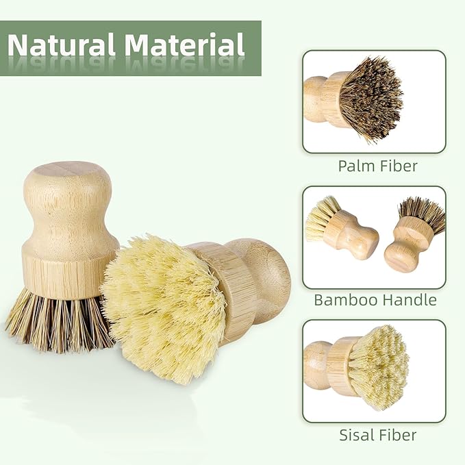 - 【Natural & Compostable Materials】Crafted with an natural bamboo handle and natural bristles (sisal + palm fiber), this dish brush set is chemical-free and fully compostable. A sustainable choice for a greener kitchen and planet!