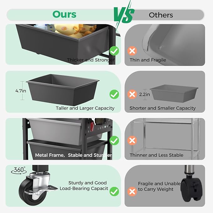 - 【Easy to Push and Lock】: This storage drawers cart comes with 4 universal wheels for 360° swivel and silent movement; the upgraded and stronger metal wheels allow smooth movement even when you are loaded with items. Meanwhile, press the toggle switch on the wheels to lock the product easily and prevent it from moving.